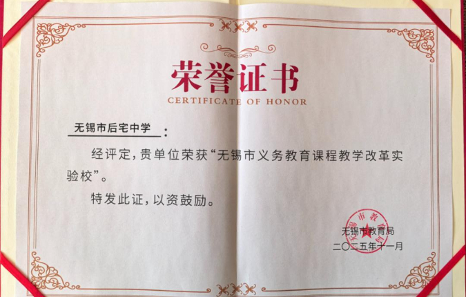 无锡市后宅中学始终以《义务教育课程方案(2022年版)》为遵循,一方面扎实推进国家课程校本化,另一方面创新构建“五位一体”课程体系,依托鸿山地域文化开发《美德与乡贤》等特色课程,“吴文化游学”入选省级游学基地,校本读物获市级教学成果特等奖。教学中以“问题链”课堂为核心,打造“导学—认知—探究—反思—拓展”闭环,结合校企共建基地开展科技教育、工程实践,推动跨学科学习落地;专任教师中,中高级职称占比超60%,省市区骨干38人,完成或在研省市级重点课题、项目10多项,教研成果丰硕。
