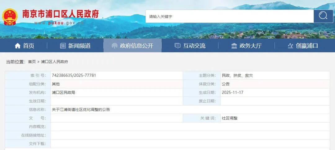 11月17日,南京市浦口区人民政府网站发布关于江浦街道社区优化调整的公告。
