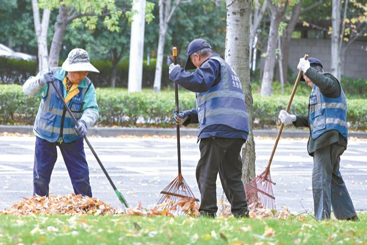 锡城降温后,马路边的落叶大量增多,市绿化和环卫部门积极清理,为市民营造洁净、优美、宜居的城市环境。图为日前大剧院路上,绿化员工正在清扫落叶。(宗晓东 摄)