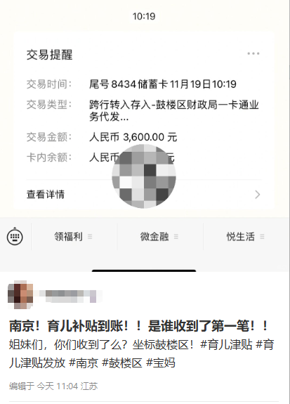 “鼓楼区育儿补贴优先到账啦,打工人忙了一上午,看到短信太惊喜啦!”“早晨收到了鼓楼区的3600元育儿补贴,立马给娃存上了!”19日上午起,育儿补贴到账成为鼓楼区居民热议的暖心话题。截止到当天16时,代发银行后台仍在陆续为鼓楼区居民发放育儿补贴款项。部分因个人原因,未能通过惠民惠农一卡通系统校验的申请人,将在核实并更新申请信息后于后续批次补充发放,确保政策红利“应发尽发”。