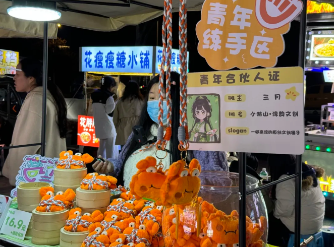 在大丰河夜市,小马灯、蟹文化等高淳本土民俗元素融入店招店牌与亮化设施;夜市中心区域特别设置了一处“青年练手区”,面向院校学生提供免费摊位及配套创业服务,让怀揣梦想的青年人在此探索、实践、圆梦。