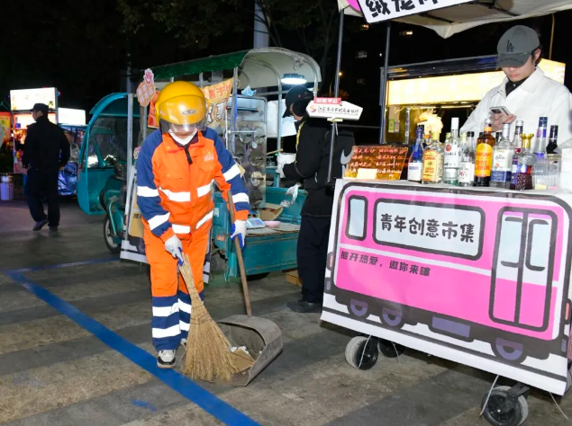 在环境卫生保障上,环卫部门创新“分散收集+集中清运+专项清理”模式:安排2名保洁员夜间巡回保洁,3名保洁员清晨集中清扫,设置15个分散垃圾桶和2个集中收集点,每日7时前完成全部垃圾清运;每周还会开展3次高压冲洗,清除地面油污,确保夜市地面清洁度达标率始终保持在98%以上。