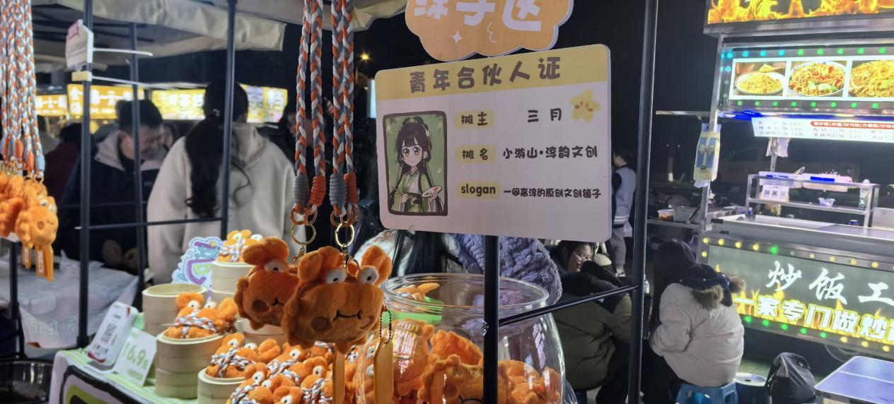 为充分激发青年创新创业热情,夜市中心区域特别设置了一处“青年练手区”,为院校学生提供免费摊位及配套创业服务。目前这里已孵化培育了12个青年创业项目,聚焦文创设计、手工艺品、特色美食等产品。相关部门在线下打造“主理人之家”、在线上成立 “主理人联盟”微信群,为青年创业者提供交流空间与创业培训,促进资源共享。除此之外也积极为摊主拓展销售渠道,推荐优质摊主参与高淳马拉松等活动,实现经济效益与社会效益相统一。