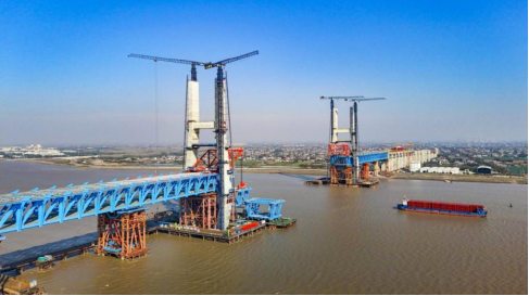 据现场技术负责人江湧介绍,随着南北边跨钢梁相继吊装就位和顶推施工的完成,崇启公铁长江大桥将开始边跨钢梁落梁、支座安装和体系转换,然后进行边跨桥面板安装与架板机安装,下一步进行中跨钢梁和斜拉索的安装。11月下旬将完成南边跨顶推作业,并与非通航孔钢梁在1号墩“会合”。主通航孔3、4号墩预计在明年“五一”前实现跨中合龙。