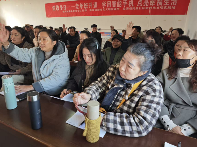 “点这个绿色图标就能和远在外地的孙子视频啦!”近日,射阳县临海镇同胜社区暖意融融,二十余位老人围坐一堂,不少座位旁还坐着专程陪同的子女——由射阳县委社会工作部主办、临海镇新时代文明实践所与同胜社区新时代文明实践站承办的“缤纷冬日——老年班开课 学用智能手机 点亮幸福生活”培训活动正在这里开展。