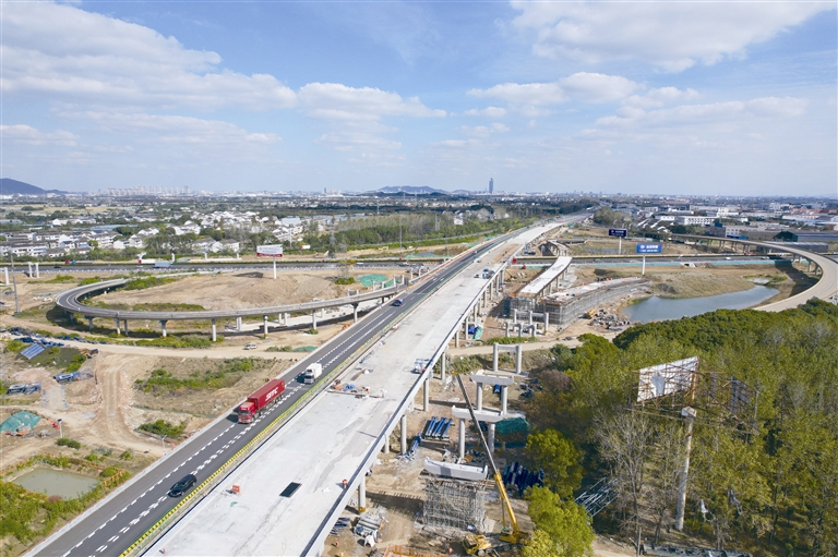 沪武高速公路扩建工程江阴段全线采用双向八车道高速公路标准进行扩建,长度约33.174公里,设计时速120公里。项目扩建后,将设互通式立交5处,有效缓解区域交通拥堵,加强地区间的沟通交流,促进沿线地方经济社会高质量发展。图为正在建设中的沪武高速徐霞客枢纽。(丁家骏 摄)