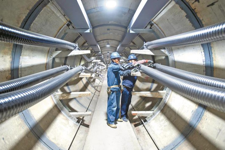 24日,电力施工人员在新吴区后宅东路地下隧道中安装220千伏电缆抱箍。近年来,为适应城市快速发展,国网无锡供电公司加大实施“电缆入地”工程,将纵横交错的架空线改为地下电缆。据了解,目前35千伏至110千伏地下高低压电缆有1321.61千米,220千伏地下电缆有157.64千米,在改善城市空间、提升城市承载能力的同时,确保了居民安全用电和电网安全稳定运行。(潘正光 摄)