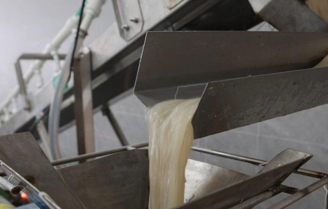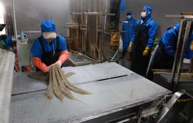 初冬的暖阳下,江苏省淮安市淮阴区南陈集镇梅畅村的粉丝加工车间里,一派繁忙景象,工人们正在流水线前熟练地和浆、漏粉丝、筛粉丝,每一个环节都井然有序。冷库内,一排排晶莹剔透的粉丝垂挂下来,在低温中冷却,等待晒干后包装上市。