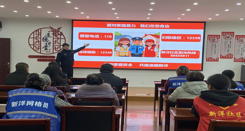 11月24日,新洋街道新洋社区党委、妇联、关工委联动街道司法所及辖区派出所,开展“普法为盾显担当 红蓝携手护‘橙’光”普法专题讲座。活动特邀辖区派出所警务人员主讲,结合真实案例通俗易懂地解读家庭暴力的定义与常见表现形式,破除“家暴是家务事”的陈旧观念。主讲人重点讲解反家庭暴力法、妇女权益保障法等相关法律中关于家暴预防处置、救助及施暴人法律责任的核心条款,详细普及维权路径。现场,“志愿红”普法志愿者向居民发放了反家暴宣传单,在小区楼栋宣传栏张贴求助指引海报,清晰标注报警电话、社区服务热线及12338妇女维权热线,确保求助渠道家喻户晓。