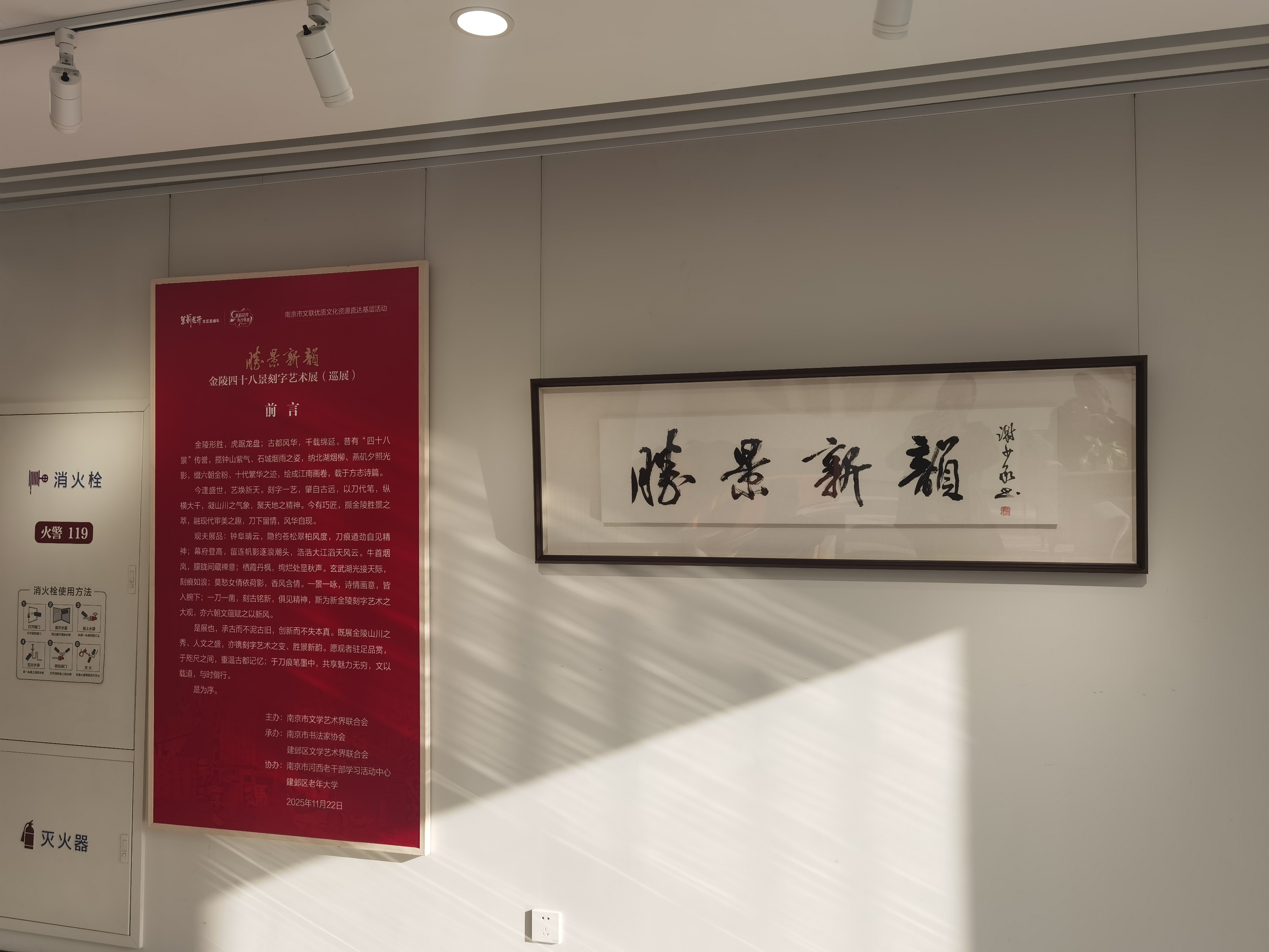 11月22日,由南京市文学艺术界联合会主办,南京市书法家协会、建邺区文学艺术界联合会承办,南京市河西老干部学习活动中心及建邺区老年大学协办的《胜景新韵•金陵四十八景刻字艺术展(巡展)》在建邺区河西老干部活动中心展出。