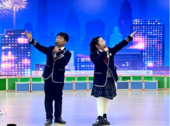 当《我和我的祖国》的旋律响起,全场氛围瞬间被推向沸腾,新时代少年的家国情怀在歌声中尽情绽放。舞台上,学生们用真挚的朗诵为祖国献礼:《运河是一位老人》以穿越时空的诗意想象,让运河与刘禹锡邂逅、为马可・波罗驻足,将千年文脉与历史沧桑娓娓道来;《故乡的月》藏着最纯粹的乡愁,“月亮躲进古井、菜地”的童趣描写,让每一缕月光都染上了故乡的温暖;《祖国的模样》《你用什么颜色描绘中国》则铺开了一幅壮丽的祖国画卷,黄河的涛声、长江的碧波、麦浪的金黄、国旗的鲜红……每一处景致都饱含深情。孩子们铿锵的语调、炽热的眼神,将对祖国的自豪与热爱展现得淋漓尽致,深深感染了在场的每一个人。
