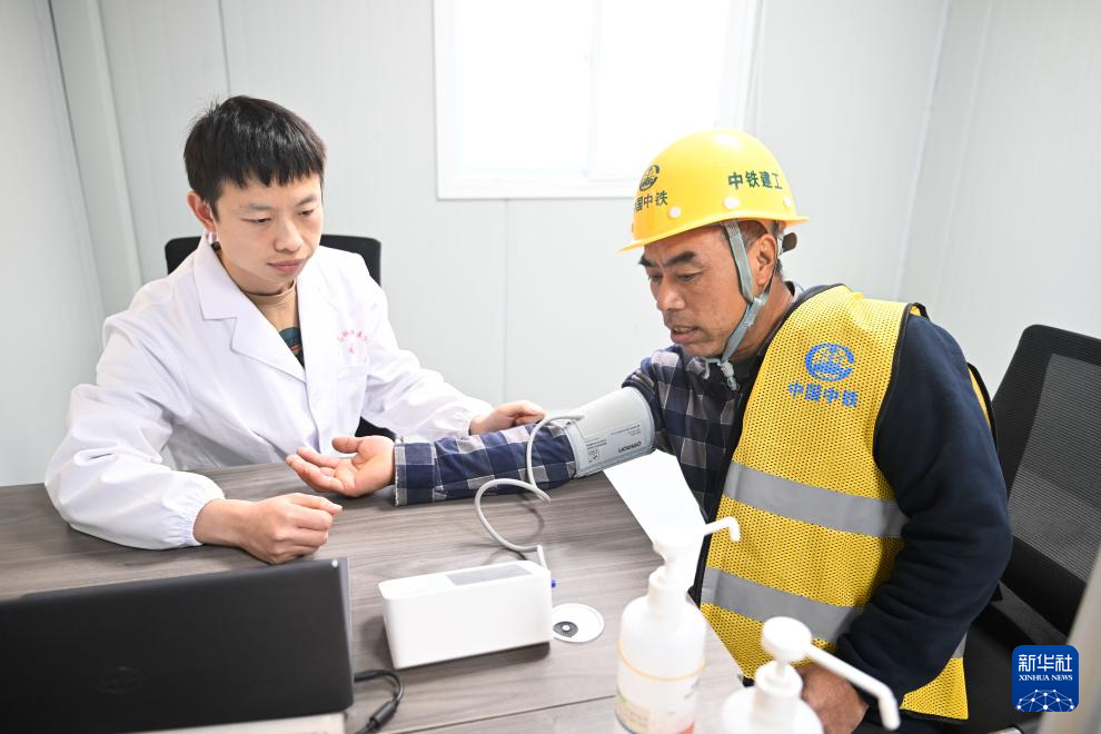 11月25日,医生在苏州北站新时代建筑工人社区卫生服务站为工人测量血压。