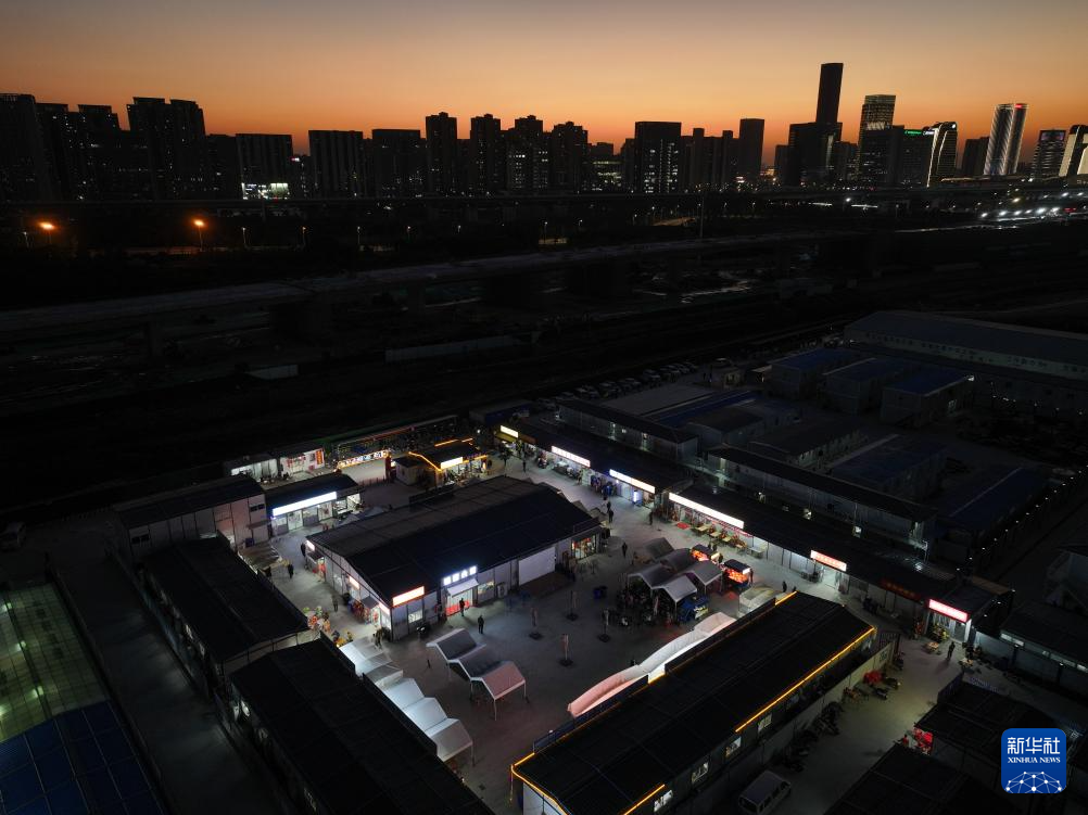 夜幕下的苏州北站新时代建筑工人社区“商业街区”(11月25日摄,无人机照片)。