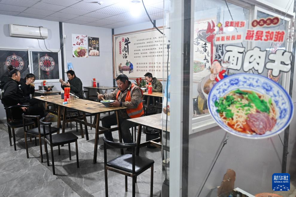 11月25日,工人下班后在苏州北站新时代建筑工人社区“商业街区”一家饭馆吃晚饭。