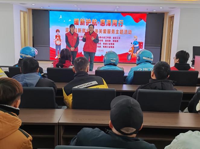 在三楼会议室内,新就业群体代表聚精会神地上着一场特殊的“课堂”,《交通事故警示》《中华人民共和国反家庭暴力法》《希望工程》等宣传片接连播放,真实的案例、通俗的讲解,让在场代表们深受触动,宣传片在传递法律知识、安全理念的同时,也将社会的关爱与牵挂送到了大家心坎里。“我们天天在路上跑,交通事故警示片里的案例给我敲了警钟,以后一定更注意安全。”货车司机张师傅认真地说。最后,工作人员还为新就业群体代表发放了由各单位、爱心企业提供的“暖新大礼包”。