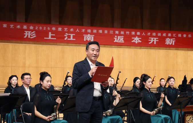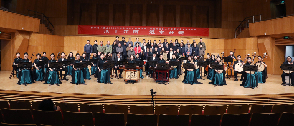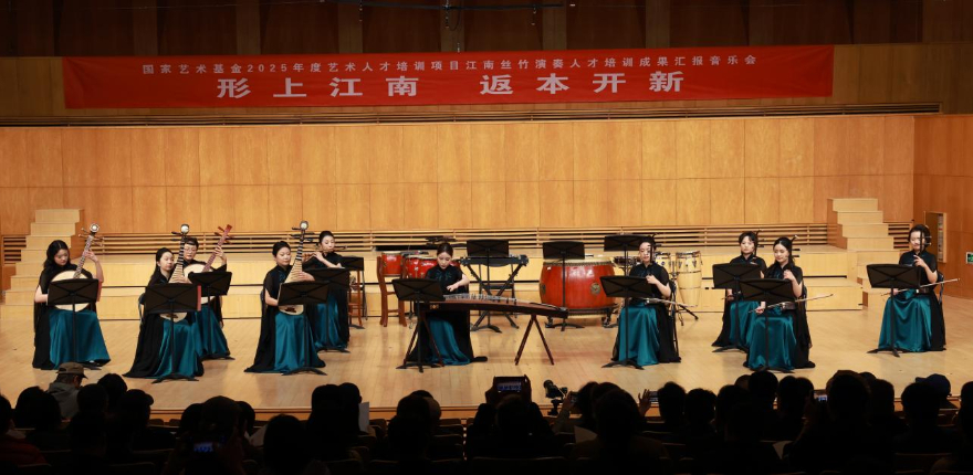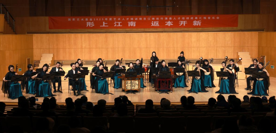 近日,2025年度国家艺术基金艺术人才培训资助项目“江南丝竹演奏人才培训”成果汇报音乐会“形上江南,返本开新”在南京艺术学院音乐厅举行。来自全国各省市民族乐团、专业音乐院校的30位学员,以灵动清雅的江南丝竹音乐,为本次培训画上圆满句点。音乐会线上线下同步呈现,邀四海知音共同沉醉于江南丝竹的千年文脉与时代新声。项目负责人、南艺音乐学院院长王晓俊教授担任导聆。