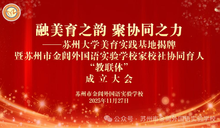 一场深耕育人新路径的教育盛会近日在苏州市金阊外国语实验学校召开。本次“融美育之韵 聚协同之力——苏州大学美育实践基地揭牌暨苏州市金阊外国语实验学校家校社协同育人‘教联体’成立大会”,既是深化“五育并举”教育方针的生动实践,更是打破资源壁垒、构建家校社生态共育体系的创新探索,标志着区域教育正式迈向“多元协同、共生发展”的新阶段,为教育高质量发展注入强劲动能。