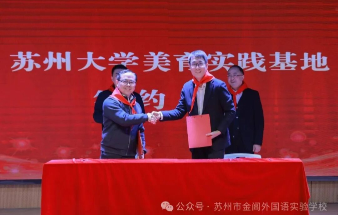 随后,苏州大学艺术教育中心副主任褚玮与苏州市金阊外国语实验学校党支部书记、校长金卫国签订《美育实践基地合作协议》,苏州大学艺术教育中心主任吴磊、姑苏区教体文旅委副主任闫明光见证并为“苏州大学美育实践基地”揭牌,标志着校校协同、以美育人的探索正式启航。
