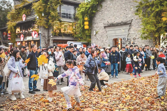 在南京老门东历史文化街区,古老的明城墙下办起“落叶音乐会”。民谣歌手在落叶铺就的舞台上弹唱,温暖的灯光透过枝叶缝隙与美景、音乐交织在一起。旁边的秋韵市集人气爆棚。限量版的秋日礼包里,装着特制的帆布包、集章地图和塑封落叶,游客们拿着地图在街区里寻宝集章,将老门东的诗意秋意收藏于日常。