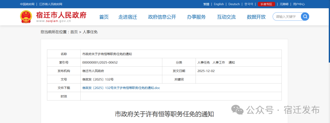 12月2日,宿迁市政府发布了最新的人事任免通知,具体如下: