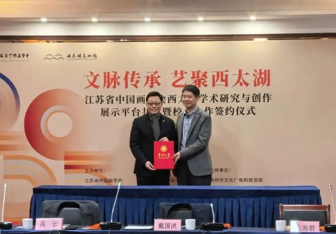 在全场嘉宾的共同见证下。常州大学、江苏理工学院共同特聘江苏省中国画学会创会会长高云为客座教授,校长陈海群、戴国洪分别为高云教授颁发聘书。作为秉持“笔墨当随人”“以变应变”创新理念的行业领军者,高云深耕艺术创作近半个世纪,作品兼具传统正脉与当代审美,更以《永乐大典》《江山如此多娇》等重大题材作品践行“为时代立传”的艺术追求,他的加盟将为高校艺术教育注入高端学术资源,助力青年艺术人才成长。随后,江苏省中国画学会会长翟优与西太湖美术馆馆长陈金柳共同签署平台共建协议,翟优会长还分别与常州大学美术与设计学院副院长(主持工作)贾韬、江苏理工学院艺术设计学院(刘海粟艺术学院)副院长(主持工作)朱亮亮签署校会合作协议,三份协议的签署为多方深度合作奠定了坚实基础。