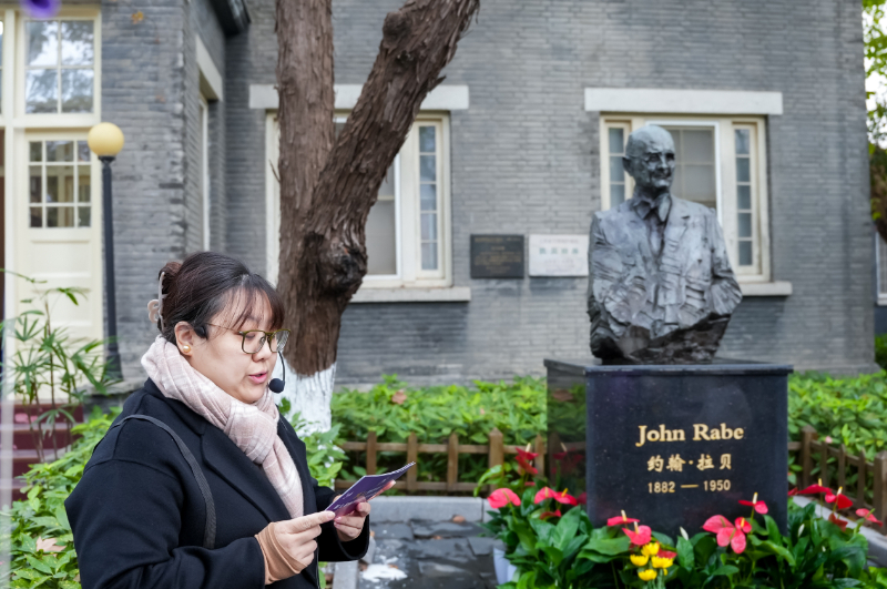 胡静雅参加“感恩·南京安全区”第九届国际和平徒步活动,现场为观众介绍约翰・拉贝的事迹