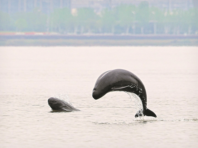 长江南京段,江豚十分活跃,不时展现一个个优雅的“水中舞蹈”动作。 (本报资料图片)