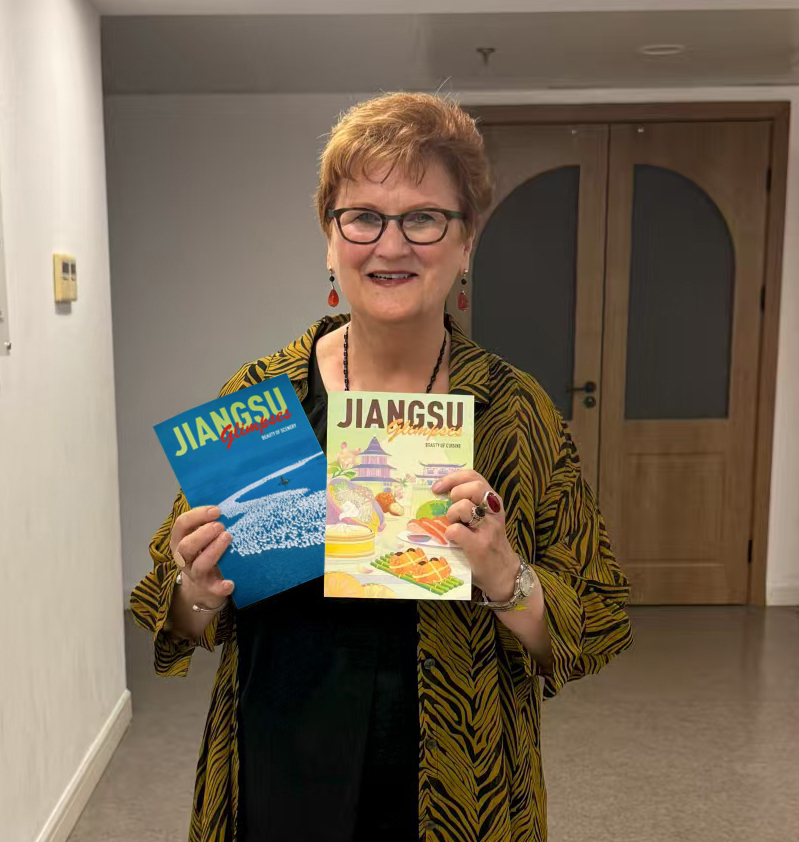 “锦绣江苏·国际青少年交流营”活动中,世界女高音歌唱家、加拿大不列颠哥伦比亚大学歌剧团艺术总监Nancy Hermiston与加拿大青年艺术家们,在江苏高校巡演《雷雨》英文话剧时推介《美的风光》。在她看来,水塑造了江苏特有的气质:像长江一样奔腾不息,像大运河一样勇往直前,像太湖一样沉静内敛、像大海一样开放包容。