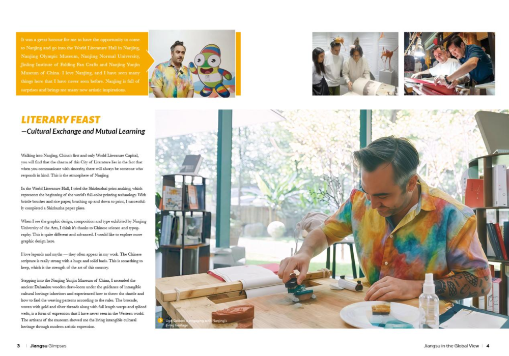 “你会发现‘世界文学之都’的魅力在于——当你怀着真诚的态度与人交流,总会有人回应你的赤诚。南京的城市氛围就是如此。”UgoGattoni写道,“在世界文学客厅,我尝试了代表世界彩色印刷技术开端的十竹斋饾版工艺;走进中国南京云锦博物馆,在非遗传承人的指导下,我坐上大花楼织机,十多分钟,我就成功地织造了一条纬线,工作人员给我比个大拇指……我计划在未来的创作中加入云锦元素,将西方艺术绘画与云锦进行融合,先以南京城市图景为元素创作一件云锦挂毯在巴黎展出。相信巴黎年轻人看到云锦这么美丽的实物后,一定会像我一样被触动到。”