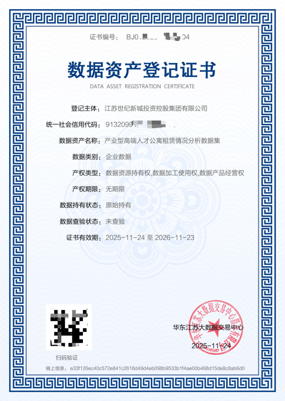 目前,这两项数据资产均已通过华东江苏大数据交易中心登记并取得数据资产登记证书。其资源持有权、加工使用权、产品经营权的明确,为后续数据合规使用、价值评估及市场流通筑牢产权基础。(祁明 丁玲 王菁菁)