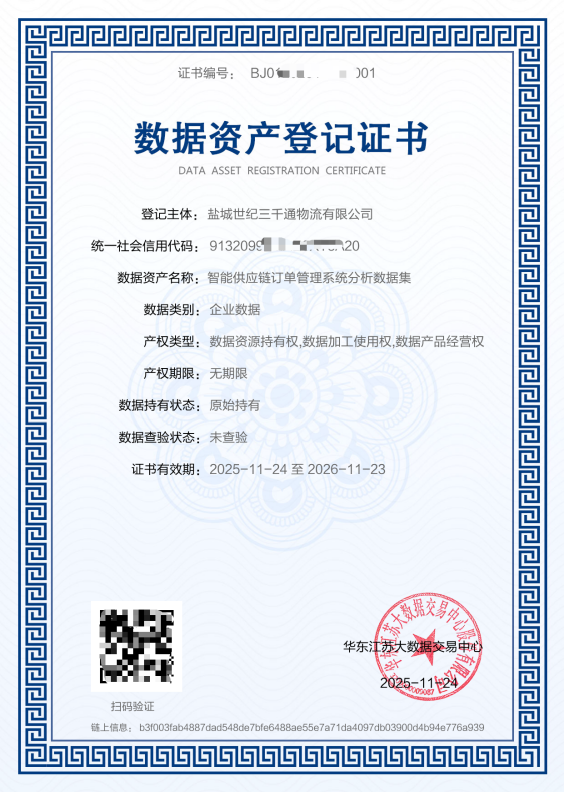 此次登记的两项数据资产,紧密契合盐城经开区产业发展方向,兼具区域特色与实用价值。其中,“产业型高端人才公寓租赁情况分析数据集”,通过深度剖析人才住房需求,为优化人才服务、完善产业配套提供关键数据支撑;“智能供应链订单管理系统分析数据集”,整合多维度物流与供应链管理数据,可用于优化物流全流程管理、提升供应链效率,为推动智慧物流提供高质量数据支撑。