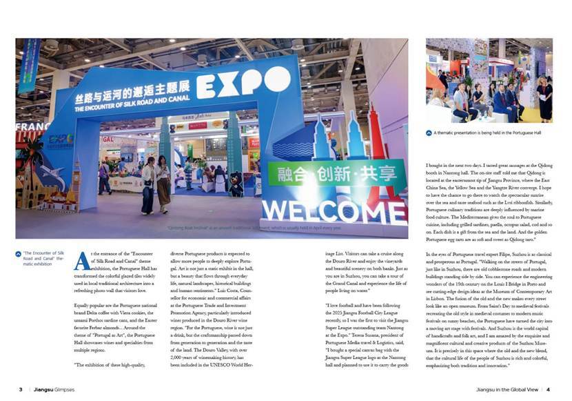 Tiago撰稿中还介绍了自己追“苏超”的经历。“我热爱足球,所以第一时间打卡了苏超中最喜欢的南通队在运博会中的城市展馆。在南通馆里,我买到了带有苏超标识足球形状的帆布包。我在南通启东展位尝到了很棒的香肠。现场工作人员告诉我,启东位于江苏最东端,东海、黄海和长江三水在启东交汇。希望有机会可以去那里欣赏海上日出的奇观,品尝吕四带鱼等海产品。相似的是,葡萄牙饮食传统深受海洋饮食文化影响。地中海赋予了葡萄牙美食灵魂——烤沙丁鱼、海鲜饭、章鱼沙拉、鳕鱼……每一道菜都是海洋与土地的礼物。而金黄的葡式蛋挞则像启东沙地芋艿一样,软糯香甜。大运河联结中外,迎接了不计其数的旅行家、使者、客商等来到中国,是中华文明与其他文明交流互鉴的重要纽带。中葡两国也因运博会上这些美妙的交流共同点拉得更近。”