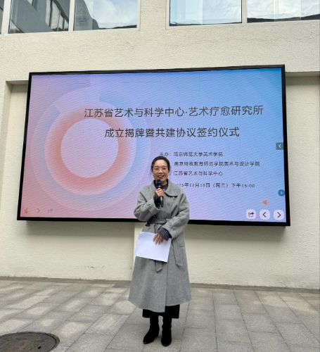南京特殊教育师范学院美术与设计学院副院长李敏随后详细说明了研究所的核心功能与建设目标。她表示,研究所将依托长三角地区的文化与科技资源,开展包括视觉艺术、音乐、戏剧、数字交互等多形式的艺术疗愈实践,并通过课程开发、评估工具设计、社区共创等方式,提升公众情绪表达能力,促进社会包容与连接。