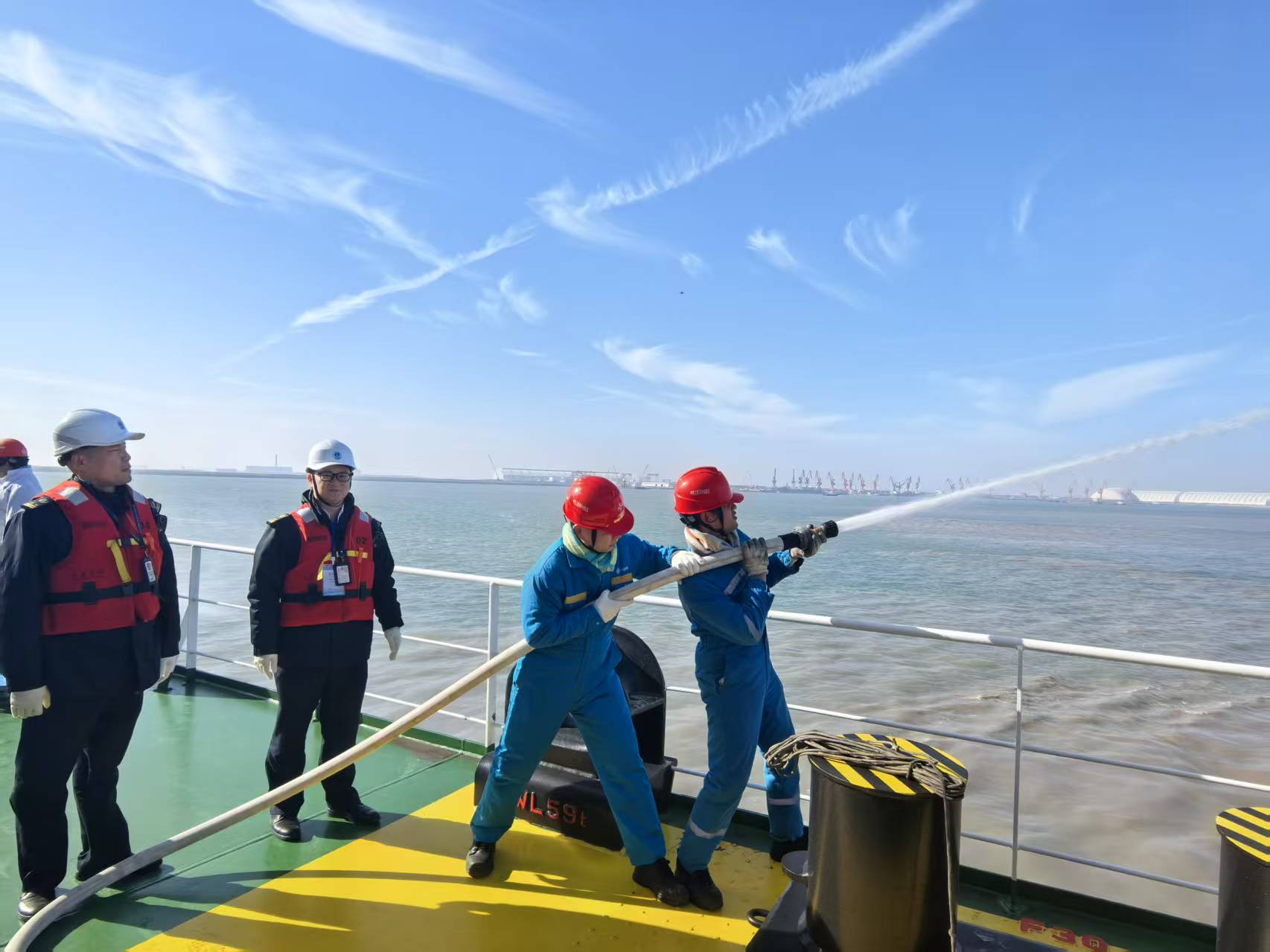 进港环节,连云港海事部门依托智慧监管平台,整合AIS动态监测、无人机巡查、海巡艇现场护航,实施水域交通组织与航行警告播发,重点核查船舶航行设备、动力系统及通航保障措施。互研环节,双方围绕LNG储存、BOG管理、燃料切换等关键环节深度交流,海事部门提供规范指导,船方分享实操经验,双向提升安全营运水平。此外,海事与船方联合开展了消防应急演习,模拟燃料舱泄漏起火场景,政企协同完成火情处置全流程,复盘优化应急响应机制。