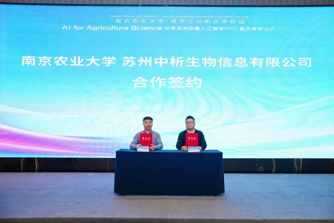 聚焦农业科学人工智能(AI for Agriculture Science) 系列成果转化应用,苏州中析生物信息有限公司董事长朱斌、南京农业大学社会合作处处长许承保分别代表企业与高校,共同签署合作协议,标志着该系列成果在产学研协同转化之路上迈出实质性步伐。