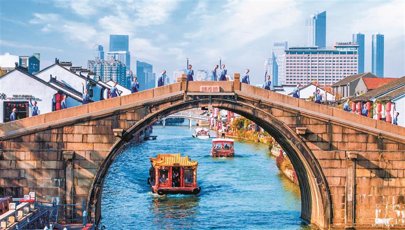 第十五届全国舞蹈展演在无锡演出以来,线下互动同样精彩。参演院团的主创、主演走出剧场,深入无锡的景区、社区开展快闪活动,打破艺术与生活的界限,让市民在日常场景中邂逅舞蹈之美。图为昨天天津歌舞团在南长街清名桥表演节目。(宗晓东 摄)