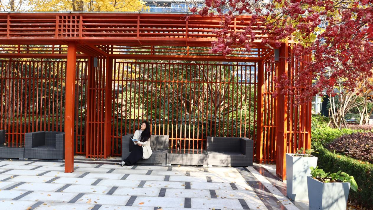 一步一景,秋色如画。秋风执笔,为蠡溪社区点染上层次分明的暖金色。门口那几株高大的银杏树,叶片如蝶纷飞,将地面铺成松软的金色地毯。居民带着孩子在这儿散步、晒太阳,欢笑声融入阳光,日常画面宁静而生动。漫步社区,喷泉溅起的水珠在阳光下闪烁如碎金;红色连廊静静伫立,与簇簇红枫、檐下灯笼彼此呼应,共同晕染出深邃而温暖的秋日氛围。
