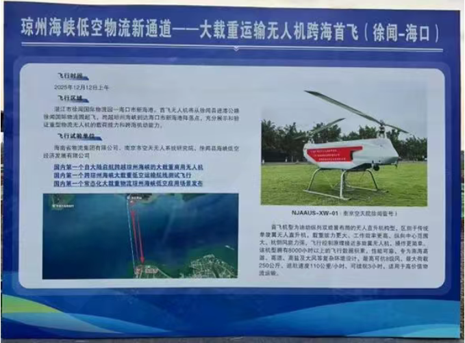 本次飞行是国内首个跨琼州海峡大载重低空运输航线测试飞行,也是国内首个常态化大载重物流琼州海峡低空应用场景发布,将传统“陆运+水运”5小时以上的物流时间缩短至20分钟,开启跨海物流新模式。未来有望实现航线定期运行。