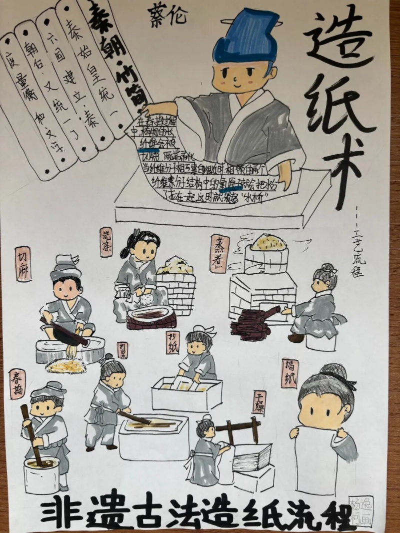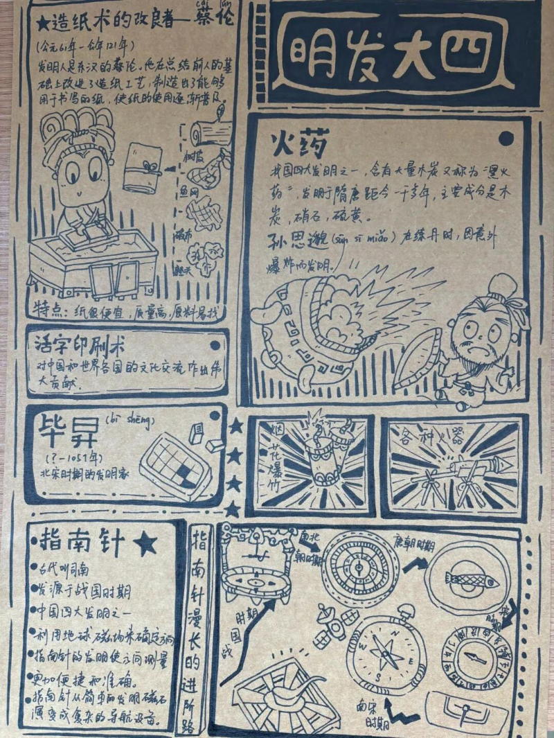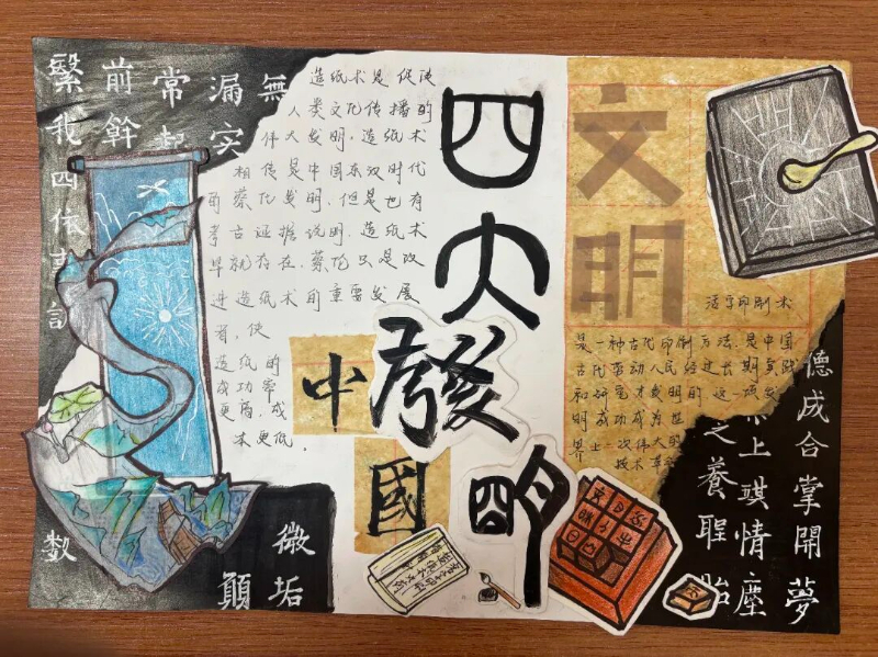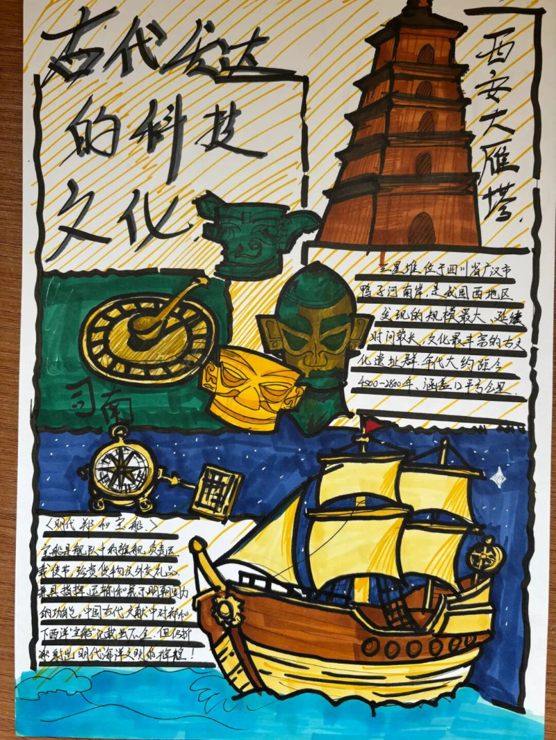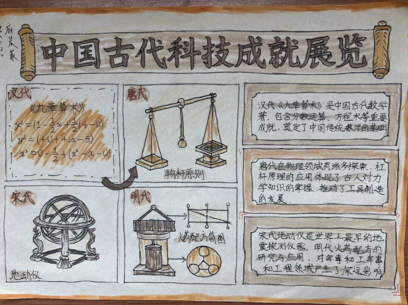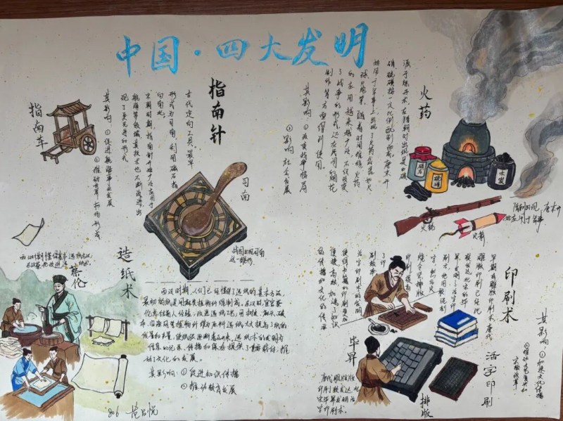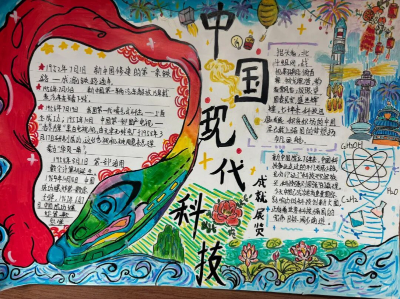 除了紧张刺激的现场竞技,本次科技节还提前设置了“中国古代科技成就展览”手抄报制作环节。同学们结合多学科知识,深入调研并精心绘制,展现了中华民族悠久灿烂的科技文明。
