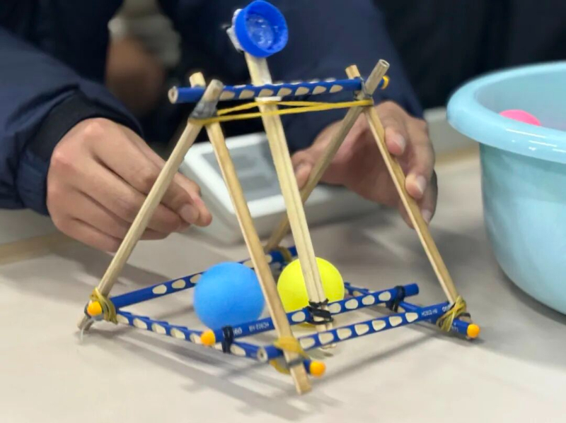 初二年级比拼“投石机投篮”,各队两人协作,操作自制投石机,力求在短时间内将更多乒乓球投入远处容器,考验了结构的稳定性与操作的精准配合。