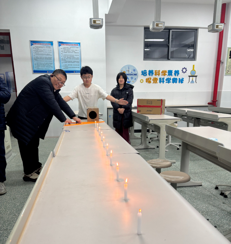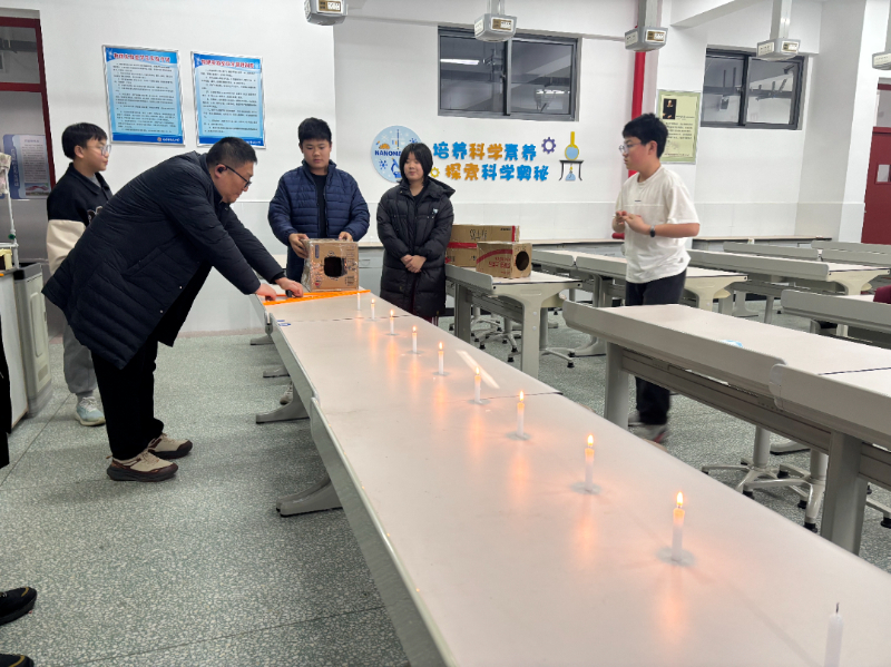 初一年级比拼“趣味空气炮”,选手们需操控自制的空气炮装置,在规定距离外精准“吹”灭蜡烛,巧妙利用气流,体会到了声音也是具有能量的。