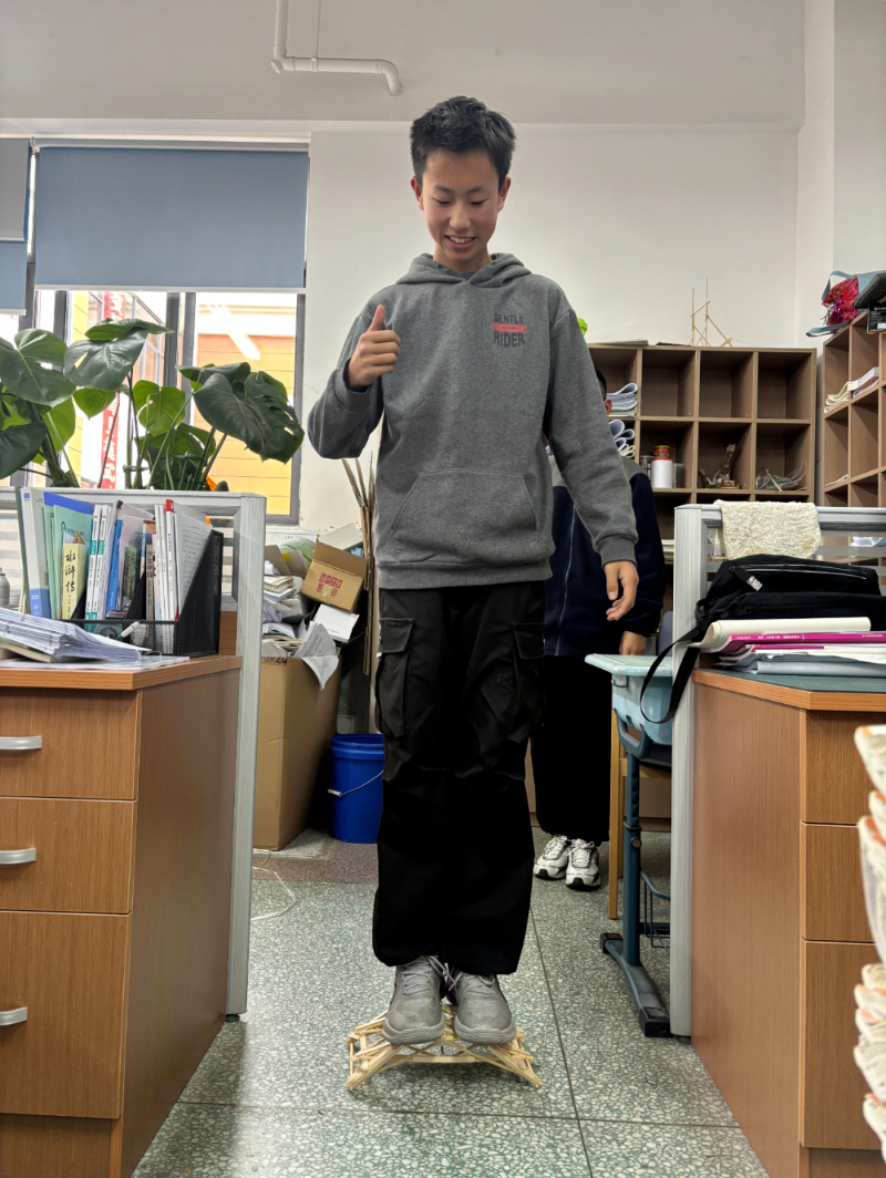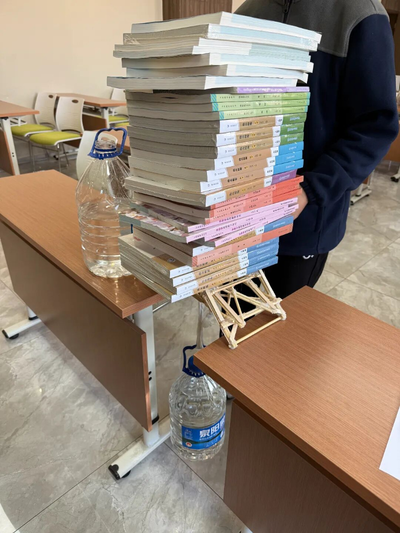 初三年级展开“桥梁承重”的终极较量,同学们运用一次性筷子、雪糕棒等材料精心制作的桥梁模型,需承受不断加挂的重物,直至极限,完美诠释了结构力学与材料科学的实践应用。