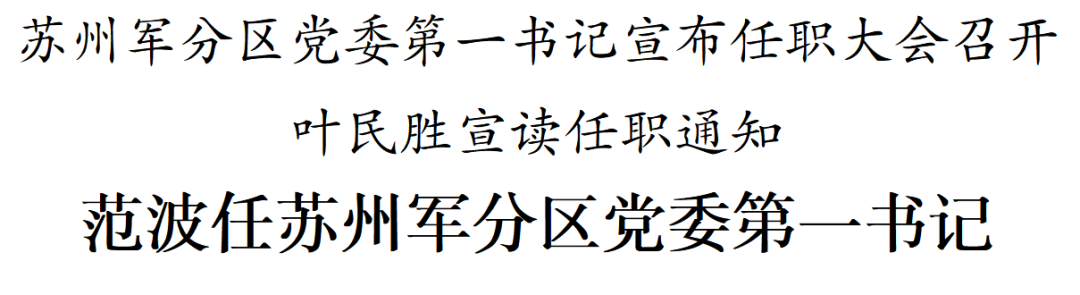 12月25日,苏州军分区党委第一书记宣布任职大会召开。省军区司令员叶民胜宣读省军区党委任职通知,并颁发任职通知书。叶民胜,苏州市委书记、苏州军分区党委第一书记范波在会上讲话。