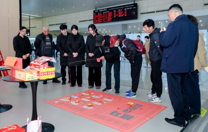 在 “一起抓好运”互动区,趣味满满的游戏引得旅客纷纷驻足、踊跃参与。大家手持钓竿,目光紧锁着象征马年好运的玩偶,全神贯注地寻找最佳时机。每一只玩偶被稳稳钓起的瞬间,都会掀起一阵小小的狂欢浪潮,欢快的气息如同春日暖风,裹挟着满满的喜悦。旅客们抓取玩偶便可兑换元旦好礼,在趣味互动中收获快乐与好运。