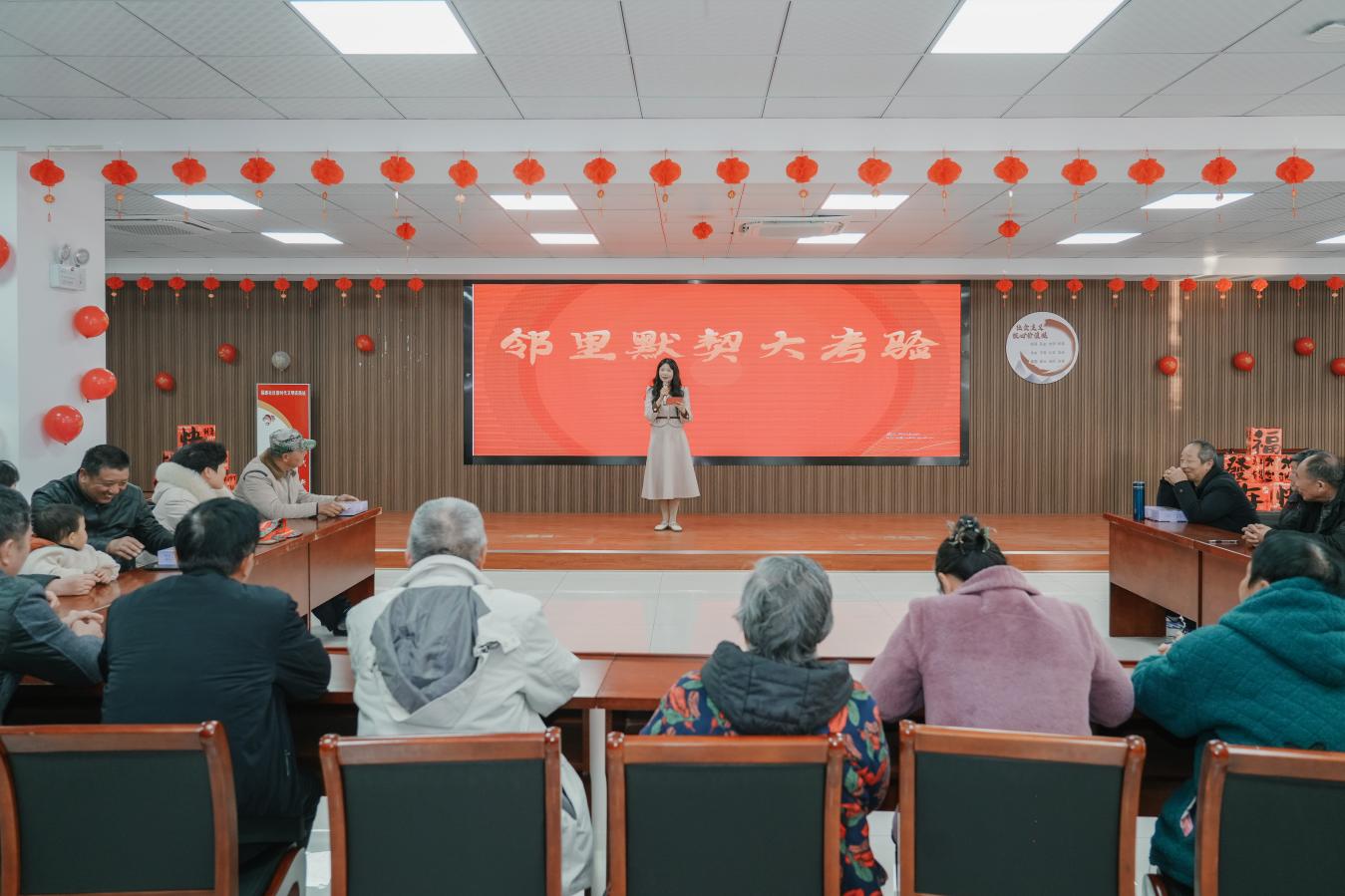 文艺展演环节,居民代表身着喜庆的服饰,携手带来经典贺岁歌曲《好运来》。台下观众跟着节奏轻轻哼唱,掌声与歌声此起彼伏;歌声落幕,社区干部代表集体登台,深情朗诵原创作品《睦邻同心向未来》。他们用铿锵有力的语调,诉说着社区工作者为民服务的初心使命,真挚的情感引发了现场居民的深刻共鸣,台下不时响起阵阵热烈的掌声。此外,社区干事通过图文并茂的PPT,生动讲述了社区内好人好事的感人事迹——有热心居民主动帮扶独居老人,有“身边好人”捐献造血干细胞……一个个暖心故事,让无私奉献的精神在潜移默化中传递,为节日增添了一抹温情底色。