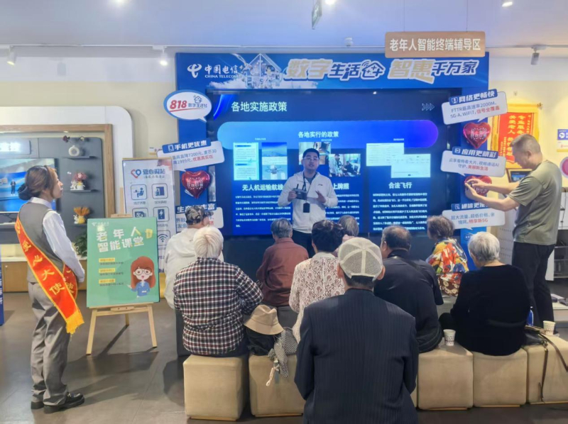 江苏电信将适老助老视为一项有温度的系统工程,构建了线上线下协同的陪伴式服务体系:线上,“企微聊”平台化身随时在线的“数字子女”,对“光猫闪红灯”“话费查询”等高频问题即时解答,通过各类触点,将智慧应用打造成银龄们的“随身辅导员”,能即问即答、引导解决,将许多困惑化解在咨询之初;线下,江苏电信在全省多地营业厅、社区广场常态化开展丰富多彩的助老活动:在南京延龄巷营业厅的“暖冬行动”中,暖饮与健康知识一同送达;在徐州彭城路营业厅的AI助老讲座上,志愿者们将技术转化为生动演示;无锡的无人机课堂则让长者在欢笑中重拾学习的自信与快乐。