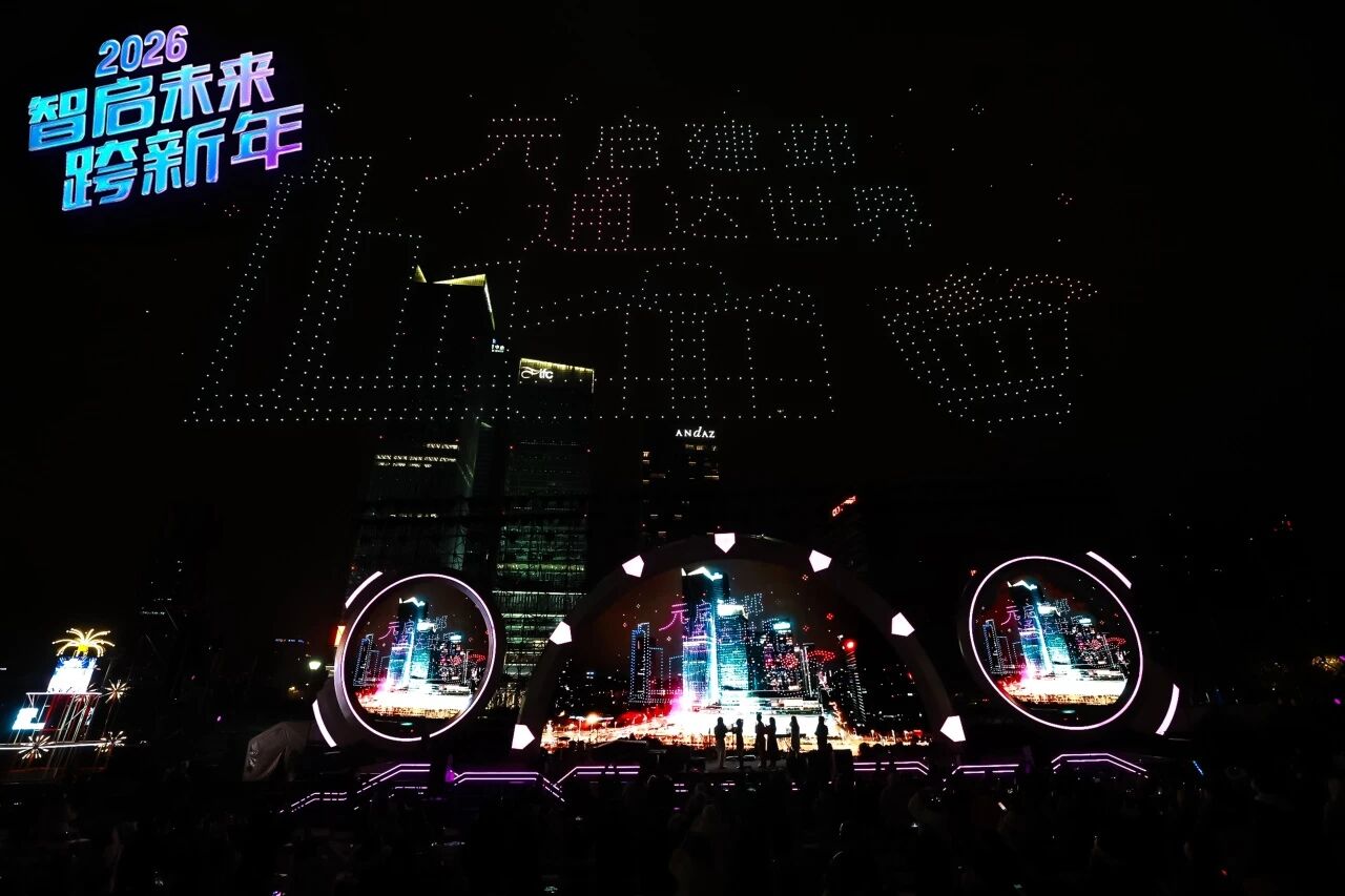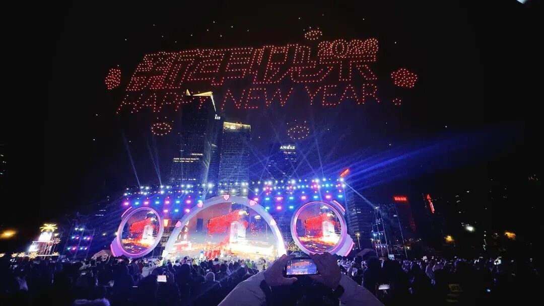 1000架无人机腾空而起,流光织就璀璨天幕,光影流转间引得观众惊呼不断,在激动人心的跨年时刻,全场齐声倒数,共同迎接2026年的到来。元通商圈主要大楼同步点亮璀璨灯光,华采天地、ifc等地标建筑在零点同步亮起,连片光影照亮夜空。继新街口成为跨年地标后,南京建邺元通商圈凭借创新巧思,跃升为南京又一“顶流”跨年打卡点。