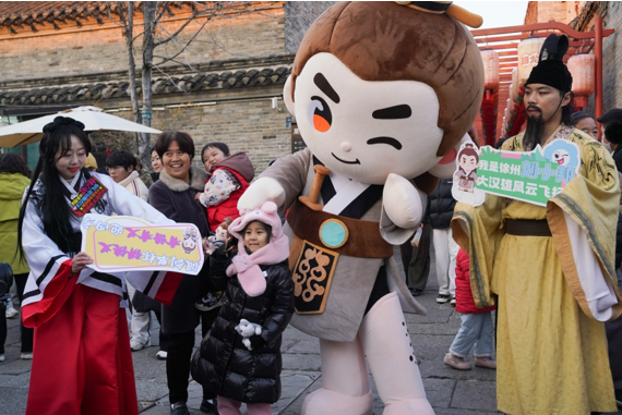 2026年元旦假期首日,徐州回龙窝历史文化街区人潮涌动。由“行走的徐州”与本土文创IP“刘小邦”联合推出的巡游快闪活动在此火热开启。憨态可掬的“刘小邦”一登场便成为焦点,不仅吸引了众多游客互动合影,也以文创之力为徐州元旦文旅注入了新活力。