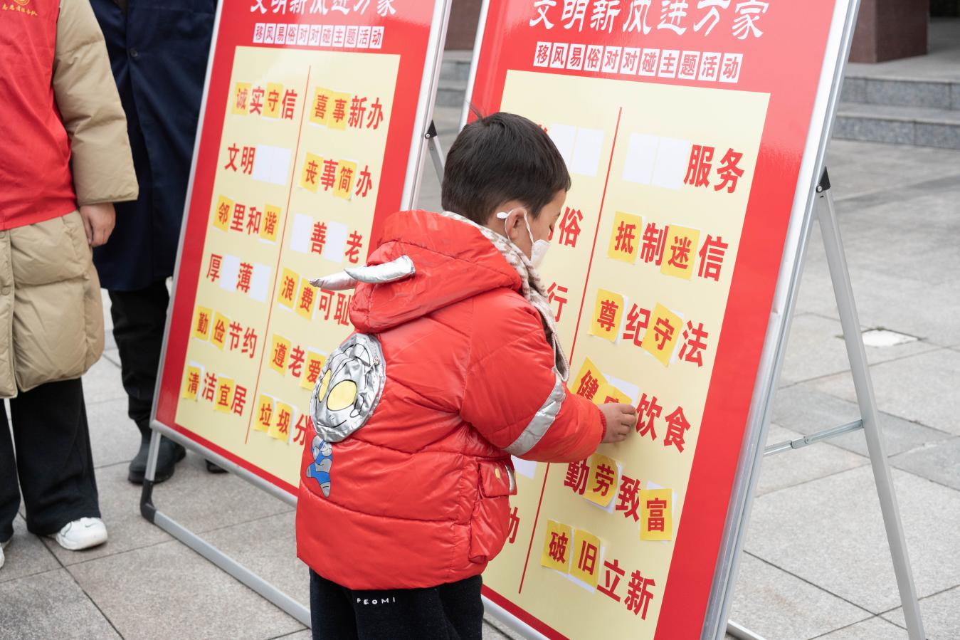 精心制作的展板一字排开成功吸引了在场的村民。展板上设计了趣味横生的“填空闯关”模式。志愿者将移风易俗的核心内容融入填空题中,如__ __分类、厚__薄 __等。村民们迫不及待在桌子上寻找合适的关键词张贴上去,只要在展板上正确填完“文明词”,即可累计积分。“带孩子参加这个活动特别有意义,不仅让他认识了什么是移风易俗,还能攒积分换奖品,孩子特别开心。”村民叶女士笑着说道。