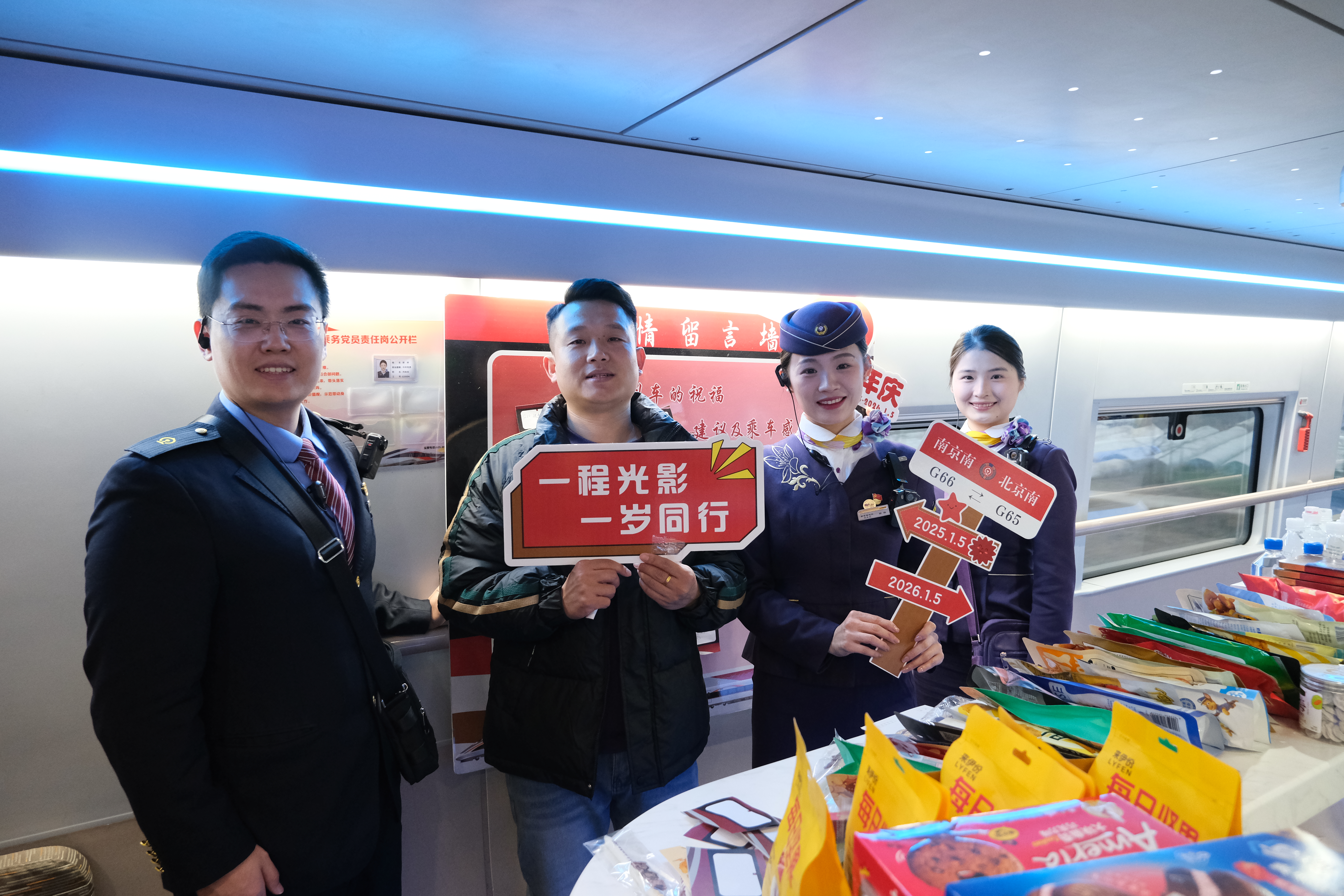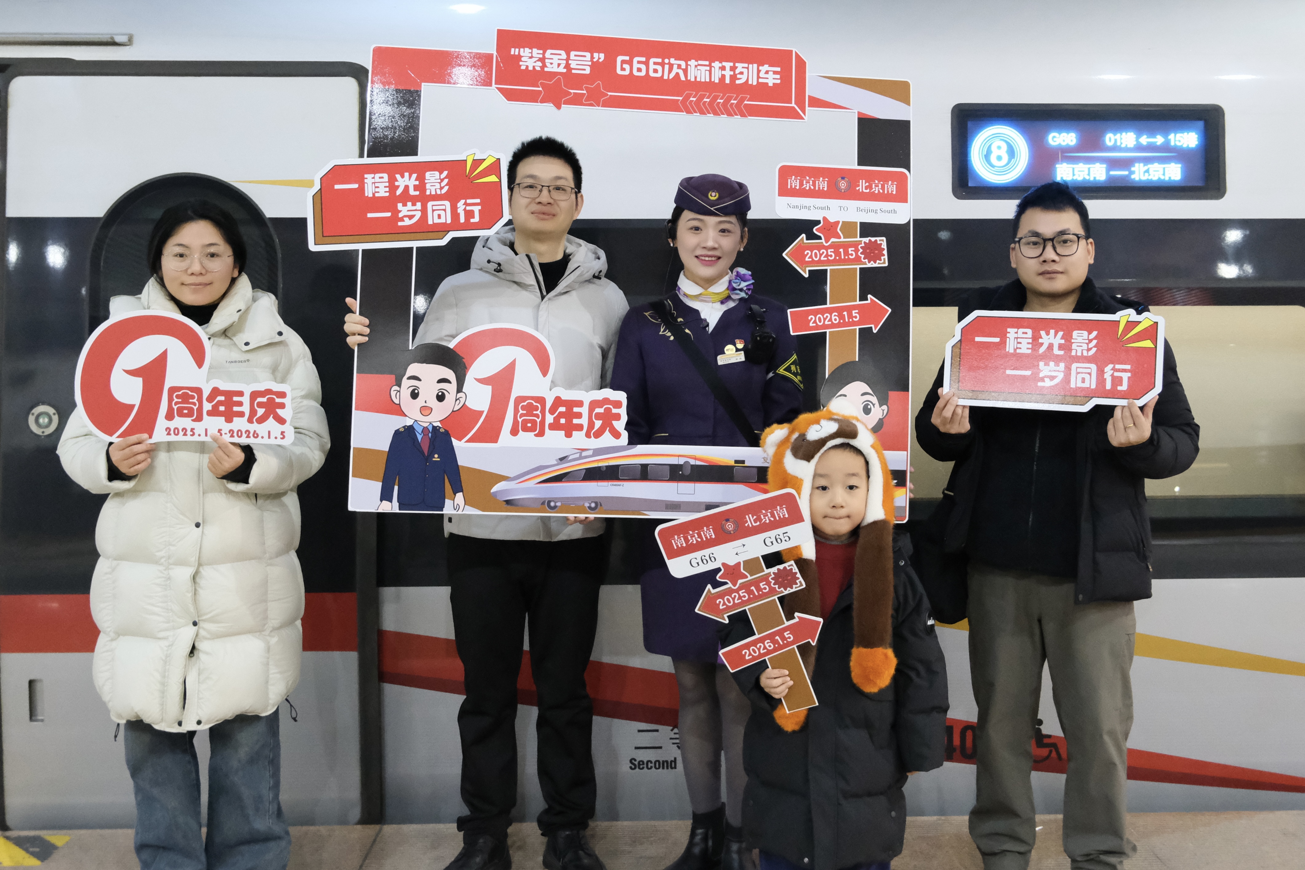 2026年1月5日,值G66次“紫金号”标杆列车开行一周年,旅客与列车工作人员打卡合影。黄雯娴摄。
